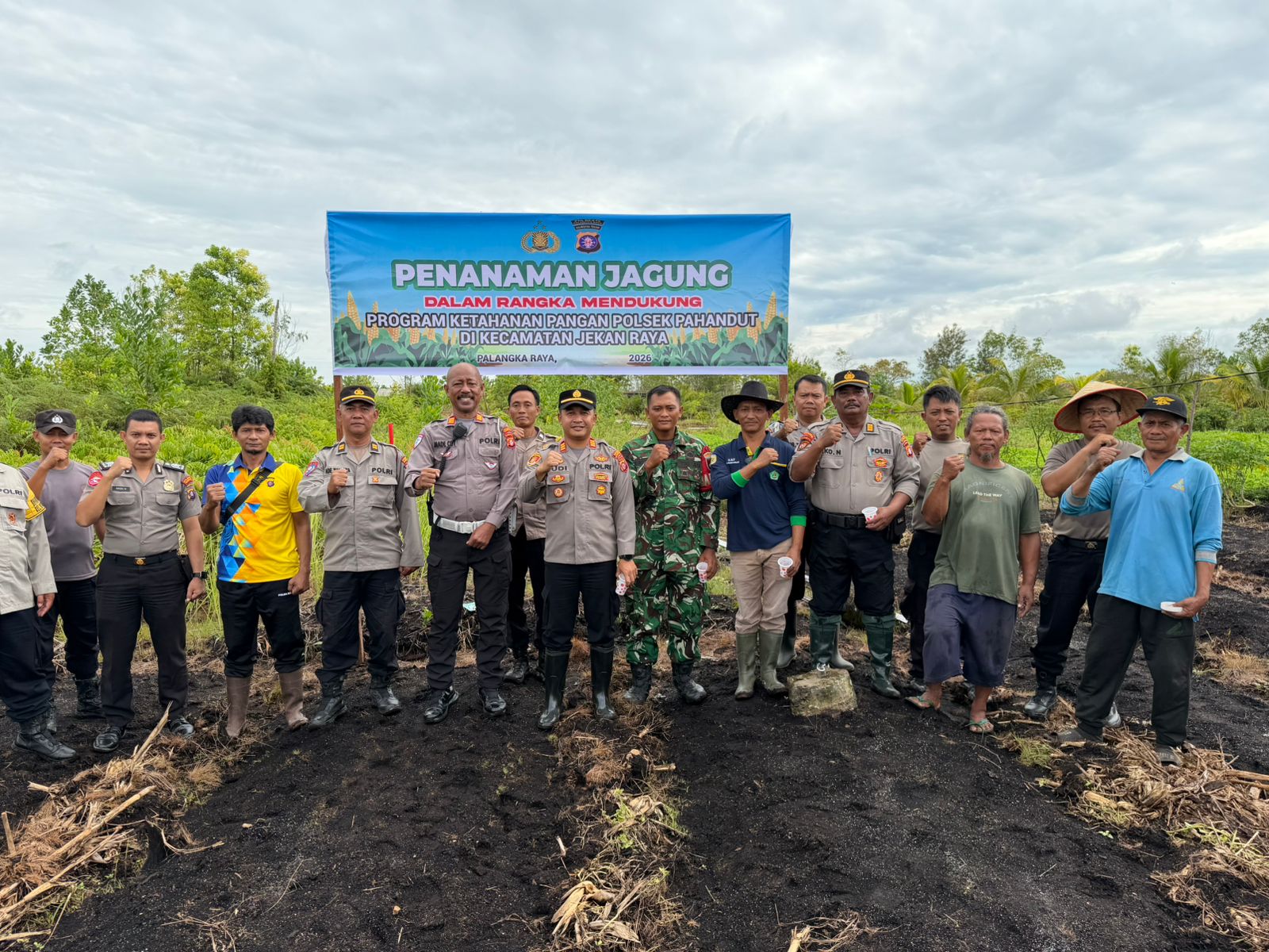 PALANGKA RAYA, Mahardeka.com — Polsek Pahandut menggelar penanaman jagung serentak di Kecamatan Jekan Raya, Palangka Raya, Jumat (13/02/2026) pukul 07.00 WIB. Kapolsek Iyudi Hartanto memimpin langsung kegiatan bersama puluhan personel, TNI, dan masyarakat untuk memperkuat ketersediaan pangan lokal.
