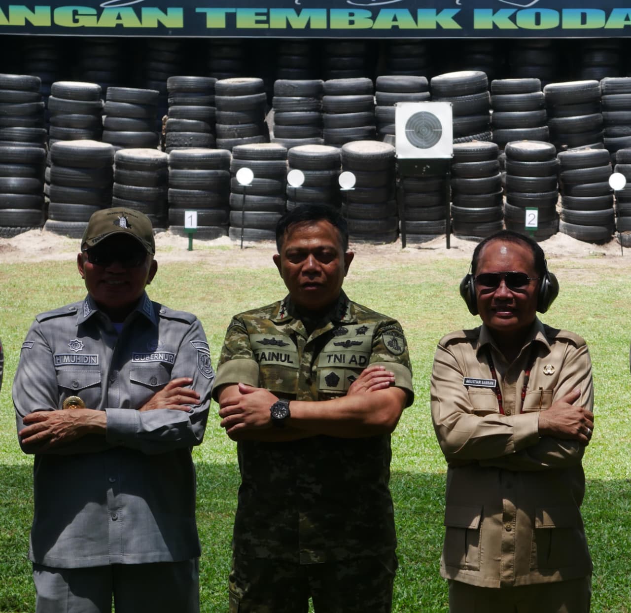 Pangdam XXII/TB, Mayjen TNI Zainul Arifin (Tengah) foto bersama Gubernur Kalteng, Agustiar Sabran (Kanan) dan Gubernur Kalsel, H. Muhidin (Kiri) usai giat Latihan Lapangan Tembak di Makodam XXII/TB, Kota Palangka Raya, Kamis (16/4/2026). Source Foto: (Harry. B/Mahardeka.com)